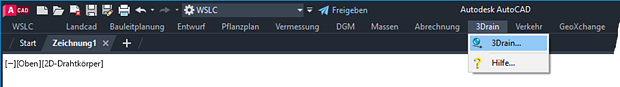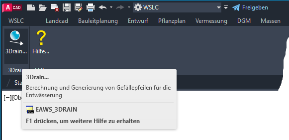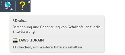 Zur Befehlsauswahl stehen je nach verwendetem CAD-System und verwendeter Konfiguration ein Register in der Multifunktionsleiste, ein Pull-down-Menü und ein Werkzeugkasten zur Verfügung, welche jeweils die gleiche Befehlsstruktur aufweisen. In diesem Modul steht lediglich der Befehl 3Drain (EAWS_3DRAIN) zur Verfügung, welcher den Hauptdialog mit der gesamten Funktionalität beinhaltet.