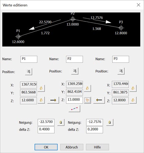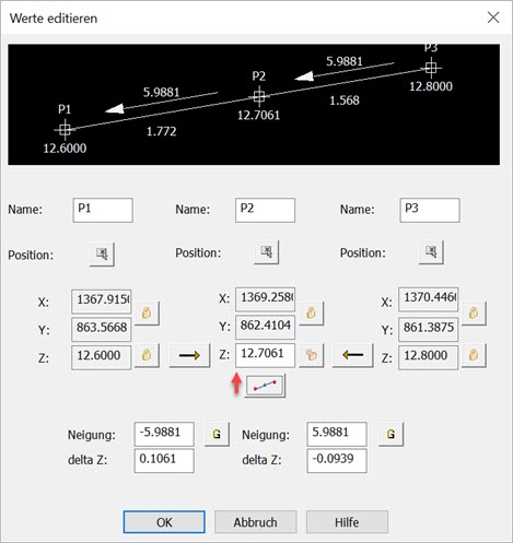 In der Mitte der Dialogbox befindet sich die Angleichen-Funktion. Hiermit kann die Höhe des mittleren Punktes so angeglichen werden, dass eine konstante Neigungssituation entlang der Punkte entsteht. Die beiden Neigungen sind dann identisch. |