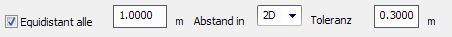 Mit dieser Option können zusätzlich zu den Hauptvertices weitere Punkte in einem gewünschten Abstand (auf den gewählten Objekten) erzeugt werden. Dabei kann der gewünschte Abstand in 2D oder in 3D angegeben werden. Die Toleranz-Einstellung dient dazu, dass die Punkte aus der Equidistanz und den Hauptvertices nicht zu dicht beieinander liegen.