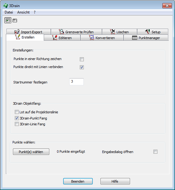 Mit dieser Funktion können assoziative 3Drain-Objekte (Punkte und Linien/Bögen mit deren Beschriftungen) erstellt werden.