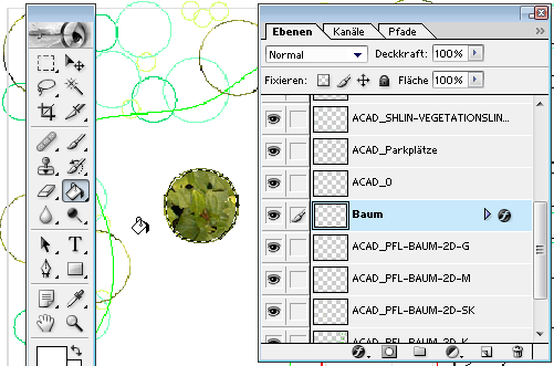 Der Sinn dieses Programms besteht im Wesentlichen darin, Grafikdarstellungen in die CAD-Zeichnung zu integrieren. Der Inhalt der CAD-Layer dient also vor allen Dingen als Orientierung und Auswahlgrenze für bestimmte grafische Operationen. Eines der wichtigsten Auswahlwerkzeuge ist hierbei der Zauberstab, der es ermöglicht, eine Fläche zu wählen, die von einer geschlossenen Form umgrenzt wird.