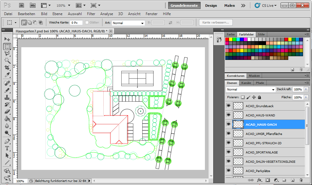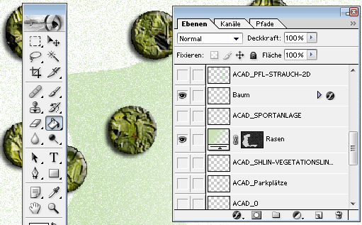 Im nächsten Schritt wird die Grundfläche ausgewählt und der neue Layer Rasen erstellt. Dieser wird zunächst mit einem leichten, konzentrischen Farbverlauf gefüllt und anschließend mit einem Störungsfilter bearbeitet, welcher zur gewünschten Struktur führt. Um dem Bild eine gewisse Tiefe zu verleihen, wird der Baum mit einem Schlagschatten versehen. Abschließend werden alle CAD-Layer sowie auch der Hintergrundlayer ausgeschaltet. Die CAD-Layer werden nicht mehr benötigt. Sie haben ihren Zweck erfüllt und sind in der CAD-Zeichnung ohnehin vorhanden. |