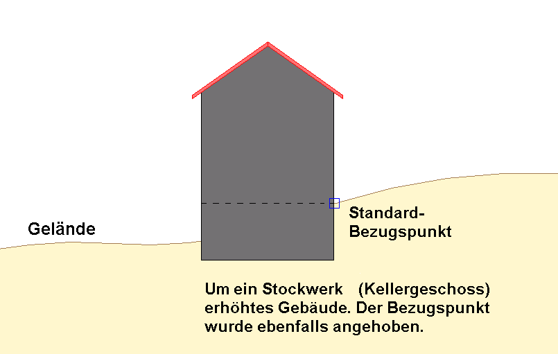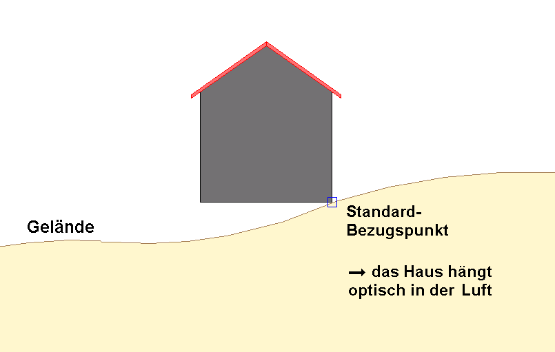 Der Bezugspunkt wird ebenfalls verwendet, wenn Sie die Gebäude auf die Oberfläche eines digitalen Geländemodells heben lassen. Bei bewegten Geländeverläufen kann es von Vorteil sein, die Gebäudehöhe um ein Kellergeschoss zu erhöhen und den Bezugspunkt entsprechend anzuheben. Damit wird verhindert, dass Gebäude je nach Hanglage mit einer Seite in der Luft schweben.