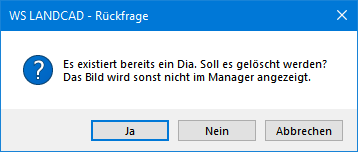 Sie können aber jederzeit ein Dia durch ein Rasterbild ersetzen, wenn Sie den Befehl Bild updaten anwenden. Da in jedem WS LANDCAD-Manager für die Anzeigepriorität die Regel Dia vor Rasterbild gilt, muss ein eventuell bereits existierendes Dia gelöscht werden. Bei einem Bildupdate erscheint daher eine Rückfrage, wenn der Manager feststellt, dass für die Schraffur bereits ein Dia existiert. Wenn Sie die Rückfrage mit Ja bestätigen, erledigt der Manager die Arbeit für Sie, löscht das vorhandene Dia und registriert das neue Rasterbild zur Anzeige der Schraffur.