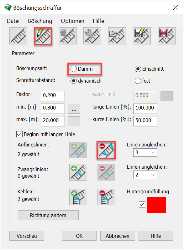 Zum Editieren ist ein Objekt einer vorhandenen Böschung auszuwählen. Daraufhin erscheint der Dialog Böschungsschraffur mit den jeweiligen Einstellungen, die beim Erstellen der Schraffur galten. Die Böschungsschraffur wird gleichzeitig in der Vorschau gemäß den Einstellungen in den Optionen dargestellt. Alle Einstellungen können nun nach Belieben geändert werden. Durch Betätigung der Schaltfläche OK wird das Editieren abgeschlossen und die Böschungsschraffur wird den geänderten Parametern entsprechend gezeichnet.