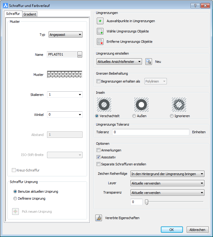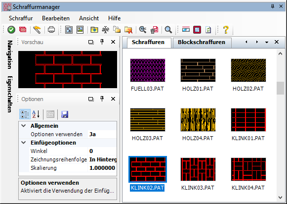 Bitte beachten Sie, dass stets die Optionswerte des Schraffurmanagers übertragen werden. Wenn z. B. die Skalierung oder der Drehwinkel anders sein sollen, können Sie dies während der Anwendung ändern, solange Sie den Befehl nicht abschließen.