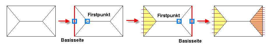 Dreieckige Dachschraffuren werden auf der Grundlage einer Basislinie (optional aus 2 Punkten) und einem Firstpunkt definiert. Der Firstpunkt wird zunächst als höchster Punkt in der Fläche angesehen und entsprechend bei der Sonnen-/ Schattenzuweisung berücksichtigt. Wird in den Optionen Einzelpunkt als First definieren "deaktiviert", besteht die Möglichkeit, die Schraffurausprägung umzukehren wie beim Satteldach beschrieben.