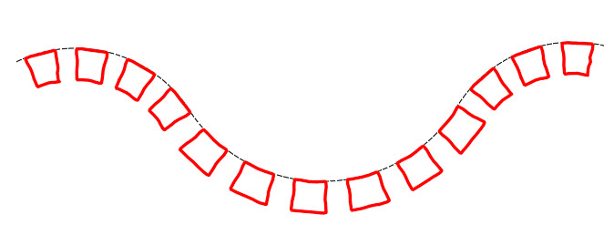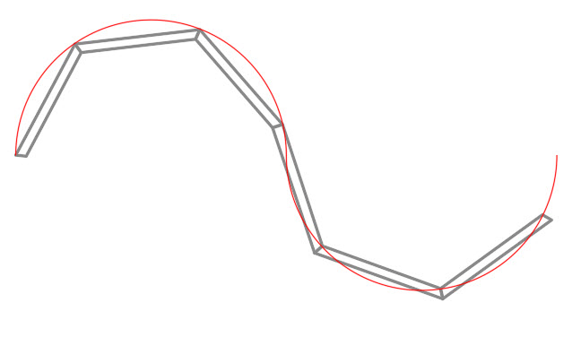Bei der weichen Generierung werden die genannten Elemente als elastische Linienstücke behandelt und dadurch dynamisch angepasst. Dies wird durch das Einsetzen von Hilfspunkten erreicht, deren Anzahl Sie aus der Popup-Liste wählen können, sobald sie die weiche Generierung ausgewählt haben. Stellen Sie sich die Anwendung eines Kantensteinmusters entlang einer gekrümmten Wegekante vor.
