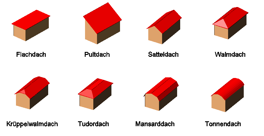 Die 8 Dachformen decken alle traditionellen Typen der Gebäudearchitektur ab. Mit Hilfe der ACIS-Verschneidungsfunktionen können auch Dachgauben ohne großen Aufwand erzeugt werden. Da die Dachkörper sowohl mit einer Dachstärke als auch mit Dachüberständen versehen werden können, ist die Darstellungsform auch für die Objektplanung ausreichend, zumal die erzeugten Gebäude mit relativ einfachen Mitteln (z. B. Fenster-Musterlinien im Linienmustermanager) optisch aufgewertet werden können.