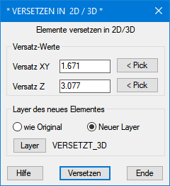 Stellen Sie daher also den Versatz XY oder Versatz Z auf den gewünschten Abstand ein (mit Picken auch durch Zeigen des Wertes in der Zeichnung). Die versetzten Elemente können auf Wunsch mit den Schaltern Layer: wie Original und Layer: Neuer Layer auf einen beliebigen Layer abgelegt werden. Neue Layer lassen sich wie im gesamten WS LANDCAD über den Button Layer bestimmen. Vorgabemäßig wird der Layer Versetzt_3D angelegt. |