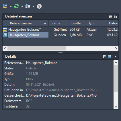 Eingefügte Pixelbilder werden in einer CAD-Zeichnung nur referenziert und nicht tatsächlich in die DWG implementiert. Werden die Pixelbilder gelöscht und z. B. durch andere ersetzt, bleibt die Zuordnung erhalten. Unter Umständen kann sich dann eine ganze Liste nicht referenzierter Bilder ansammeln. Sie können dies mit dem CAD-Dialog für Externe Referenzen kontrollieren, welcher auch über entsprechende Werkzeuge, z. B. zum Lösen von Bildern, verfügt. |