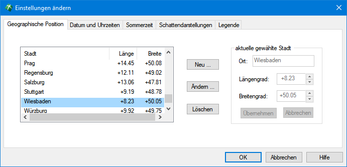 Die Einstellungen zur geographischen Position bestimmen den Standort nach Längengrad und Breitengrad. Es sind hierbei einige Standorte voreingestellt, es ist aber auch möglich, anhand der bekannten geographischen Lage neue Standorte einzugeben oder vorhandene zu ändern. Durch Betätigen des Schalters Übernehmen im Auswahl-Fenster werden die neuen bzw. geänderten Standorte in der Datei SCHATTEN.DAT gespeichert.