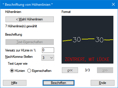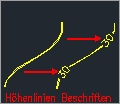 Mit dieser Funktion können Höhenlinien automatisch und auf verschiedene Arten komfortabel beschriftet werden. Die Höhenlinien werden hierbei mit Hilfe einer Zaunlinie ausgewählt und automatisch aufgebrochen, wenn der zentrierte Beschriftungsstil gewählt wird. |