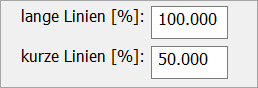 Die Länge der langen und kurzen Linien wird jeweils in Prozent (%) des Abstands zwischen den Böschungskanten angegeben. Bei der Standardschraffur verlaufen die langen Linien komplett von der Ober- zur Unterkante (100%), während die kurzen Linien nur halb so lang sind (50%). |