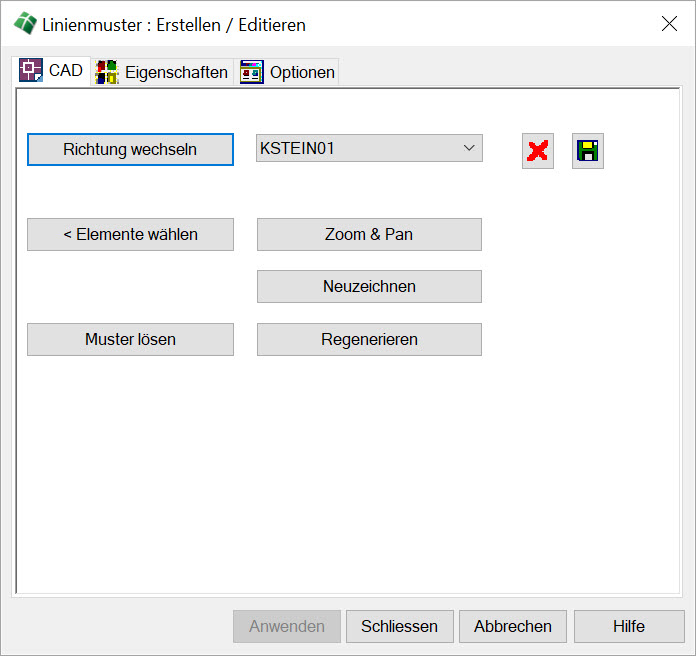 Die Dialogbox Linienmuster: Erstellen / Editieren stellt auf drei Registerkarten eine Vielzahl von Editiermöglichkeiten zur Verfügung und erscheint automatisch nach der Generierung eines Linienmusters oder beim Aufruf des Befehls Linienmuster editieren. Der Aufruf ist auch als Muster Editieren im Pull-down-Menü und der Toolbar des Linienmustermanagers vorhanden. |