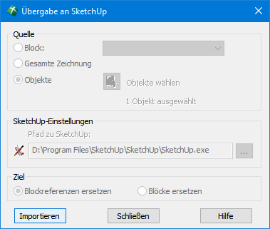 Die SketchUp-Schnittstelle beinhaltet neben dem i. d. R. automatisch ausgeführten Datenaustausch auch die Möglichkeit, die Zeichnungsdaten auf halbautomatischen Weg auszutauschen. Diese Möglichkeit wurde für die Fälle vorgesehen, in denen die Automatik z. B. aufgrund einer gestörten Schnittstellen-Kommunikation nicht erfolgreich ist. Dazu ist das Modell in SketchUp über den Befehl Datei → Exportieren → 3D-Modell zunächst in eine DWG-Datei beliebigen Namens zu speichern. SketchUp kann danach verlassen werden. In WS LANDCAD ist anschließend die Schaltfläche Importieren zu betätigen, worauf ein Standard-Dateidialog erscheint, mit dem Sie die zuvor erstellte DWG auswählen können. |