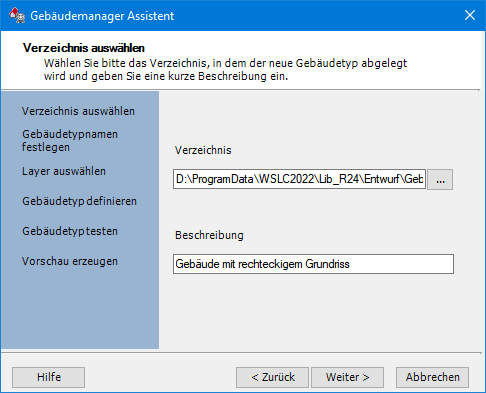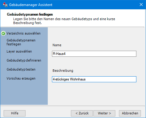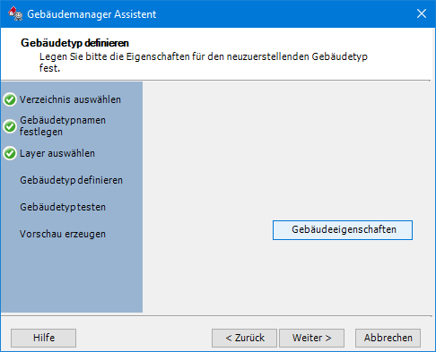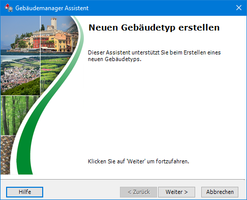 Die Erzeugung eines neuen Gebäudes wird durch einen Assistenten geleitet, welcher nach Auswahl des Befehls Neu... aus dem Kontextmenü oder dem Pull-down-Menü Gebäude erscheint. |