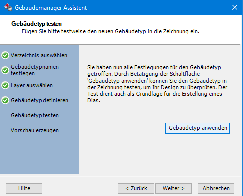 Im fünften Schritt haben Sie die Möglichkeit das soeben erstellte Gebäude zu testen. Sollte das Muster noch nicht Ihren Vorstellungen entsprechen, können Sie über < Zurück entsprechende Änderungen vornehmen. |