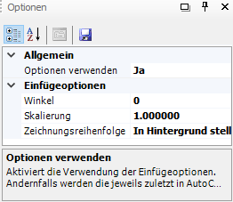 Die Optionen regeln Vorgabewerte einer Schraffur. Je nach gewähltem Schraffurtyp stehen daher auch unterschiedliche Festlegungen zur Verfügung. CAD-Schraffuren verfügen über folgende Einfügeoptionen:
