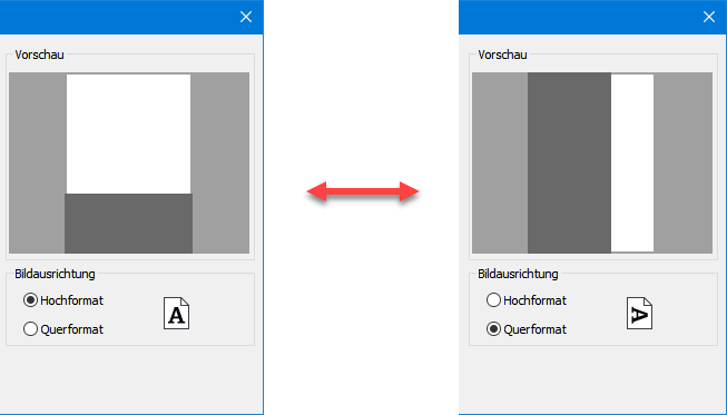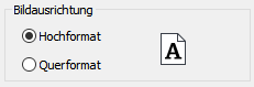 Durch Betätigung des Icons für das Papierformat erhalten sie auch eine generelle Vorschau auf das gewählte Format durch das verwendete CAD-Programm. Im Dialogbereich Bildausrichtung kann hierbei zwischen Hochformat und Querformat gewechselt werden. |