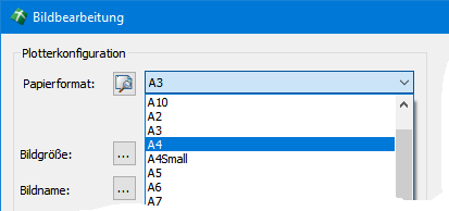 Die Plotterkonfiguration wird im oberen Teil des Dialoges eingestellt. Wählen Sie zunächst ein geeignetes Papierformat aus der Klappliste aus. Diese enthält alle in Windows verfügbaren Formate.