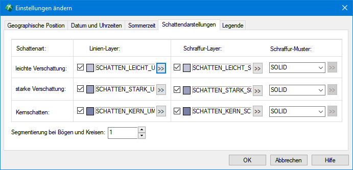 Die Linien-Layer und die Schraffur-Layer, auf denen die Schattendarstellung erstellt wird, können bei Anwendung des Schattenwurfes automatisch angelegt werden. Diese untergliedern sich gemäß der darauf angelegten Verschattungsbereiche in die Layer für leichte Verschattung, starke Verschattung und Kernschatten.