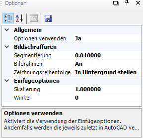 Die Optionen regeln Vorgabewerte einer Schraffur. Je nach gewähltem Schraffurtyp stehen daher auch unterschiedliche Festlegungen zur Verfügung, welche automatisch eingeblendet werden, sobald ein Muster gewählt ist. So verwenden Blockschraffuren und Bildschraffuren zusätzlich eine Segmentierung für vorhandene Bögen der Umgrenzungen. Bei Bildschraffuren ist zusätzlich die Steuerung des Bildrahmens in den Optionen vorhanden. Die Anzeige von Bildrahmen kann darüber global ein- oder ausgeschaltet werden. |