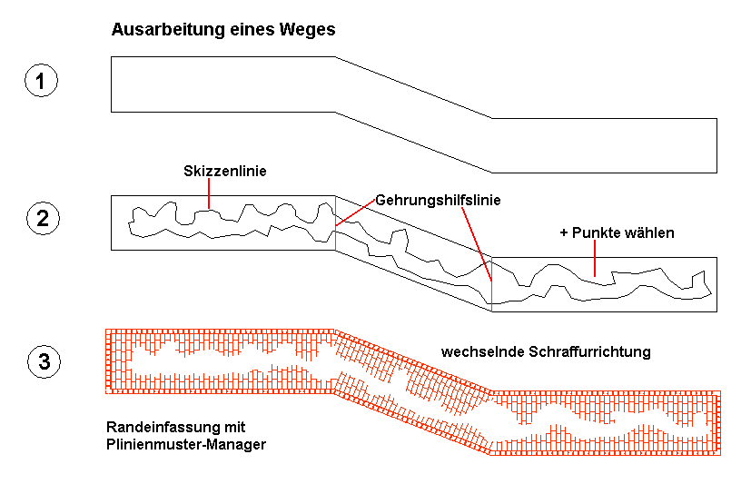 Ein gut gemeinter Tipp: Eine Schraffur lebt von ihrer Lebendigkeit. Auch CAD-Schraffuren müssen nicht zwangsläufig starr sein. Verwenden Sie z. B. unregelmäßige Freihandlinien zur Aussparung von Flächen. Zeichnen Sie Hilfslinien und schraffieren Sie auch einmal nur Teilbereiche einer Fläche. Die nachfolgende Grafik dokumentiert einen möglichen Arbeitsablauf zur Ausgestaltung einer Wegefläche: |