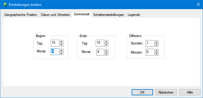 Die Dauer der Sommerzeit und die damit zusammenhängende zeitliche Differenz, die sich daraus ergibt, können durch diese Einstellungen bei der Berechnung des Schattenwurfes berücksichtigt werden. Die entsprechenden Daten müssen in die dafür vorgesehenen Felder eingetragen werden.