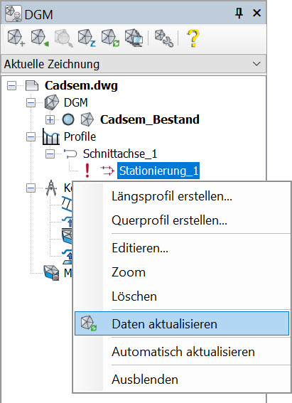 Jeder Stationierung wird bei Änderungen der Schnittachse automatisch aktualisiert. Diese Aktualisierung kann jederzeit deaktiviert bzw. aktiviert werden. Die Kennzeichnung nicht mehr aktueller Stationierungen erfolgt durch ein rotes Ausrufungszeichen (!). Bei allen Stationierungen, deren Status auf manuelles aktualisieren gesetzt ist, wird zusätzlich die Funktion Daten aktualisieren im Kontextmenü angezeigt. Mit dieser Funktion können Sie die entsprechenden Stationierungen nun bei Bedarf aktualisieren. Alternativ besteht natürlich auch die Möglichkeit, wieder auf die automatische Aktualisierung zu wechseln. |