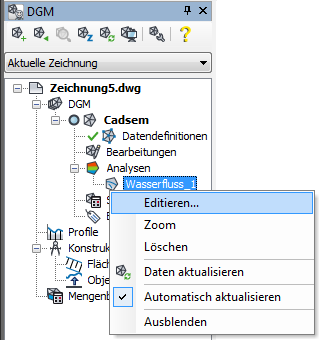 Automatische Aktualisierung - Jede Analyse wird bei Änderungen innerhalb des Oberflächenmodells automatisch aktualisiert. Diese Aktualisierung kann jederzeit deaktiviert bzw. aktiviert werden. Wenn die automatische Aktualisierung deaktiviert wurde, erfolgt eine Kennzeichnung im Werkzeugbereich des DGMs, wenn sich die Oberflächeninformationen geändert haben. In diesem Fall besteht die Möglichkeit der manuellen Aktualisierung der Analyse mit der Funktion Daten aktualisieren, welche Sie aus dem Kontextmenü aufrufen können.