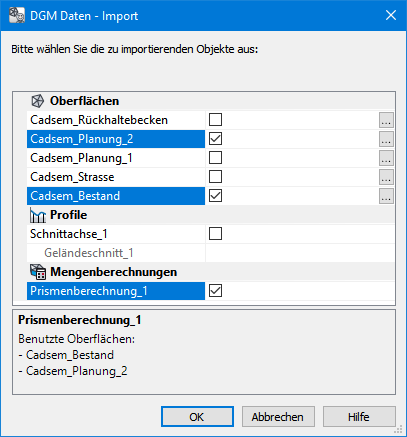 Hinweis: Alle DGM-Daten sind an die jeweiligen Oberflächen gebunden. Zum Import von abgeleiteten Objekten und Berechnungen müssen daher die daran beteiligten Oberflächen ebenfalls importiert werden. Dies wird dadurch erleichtert, dass jeweils benutzte Oberflächen im Dialog angegeben werden, wenn auf ein Objekt geklickt wird. |