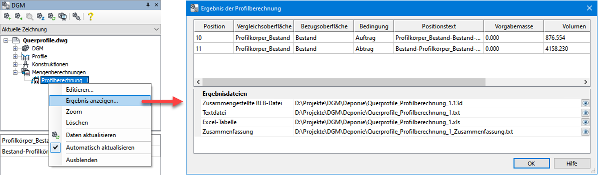 Der Ergebnisdialog kann jederzeit aus dem Kontextmenü des Mengeneintrags der Profilberechnung aufgerufen werden.