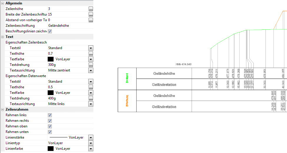 Für die Geländehöhen können die Eigenschaften für den Textstil, Texthöhe, Textfarbe, Textdrehung und die Textausrichtung, getrennt für den Zeilenkopf und die Datenwerte, definiert werden. Die Tabellenzeile selbst kann mit einem Rahmen umgrenzt werden, wofür die Eigenschaften der Rahmenelemente als Optionen definierbar sind.