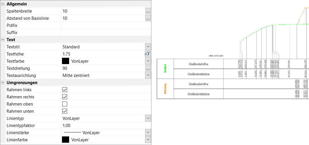 Für den Geländenamen können die Eigenschaften für den Textstil, Texthöhe, Textfarbe, Textdrehung und die Textausrichtung definiert werden. Die Tabellenzeile selbst kann mit einem Rahmen umgrenzt werden, wofür die Eigenschaften der Rahmenelemente definierbar sind.