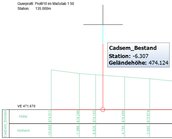 Mit dieser Funktion wird ein manueller Beschriftungspunkt im Querprofil ausgewählt. Das Dialogfeld wird dabei temporär geschlossen. Von der aktuellen Position des Cursors in der Zeichnung wird eine temporäre Stationslinie lotrecht auf das Profil angezeigt. Der Tooltipp verfügt hierbei über die Werte für die Station und die Geländehöhe sowie die Bezeichnung der aktuell gewählten Oberfläche. Durch betätigen der Eingabetaste gelangen Sie zurück in den Editierdialog. Der Stationswert kann im Dialog bei Bedarf editiert werden und wird daraufhin in das Querprofil eingetragen. |