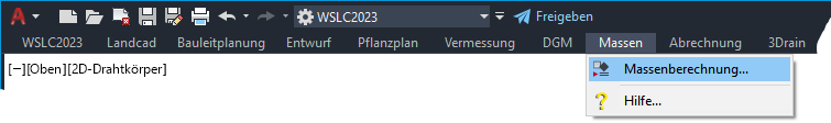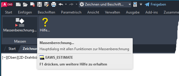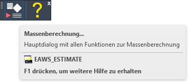 Zur Befehlsauswahl stehen je nach verwendetem CAD-System und verwendeter Konfiguration ein Register in der Multifunktionsleiste, ein Pull-down-Menü und ein Werkzeugkasten zur Verfügung, welche jeweils die gleiche Befehlsstruktur aufweisen. In diesem Modul steht lediglich der Befehl Massenberechnung (EAWS_ESTIMATE) zur Verfügung, welcher den Hauptdialog mit der gesamten Funktionalität beinhaltet.