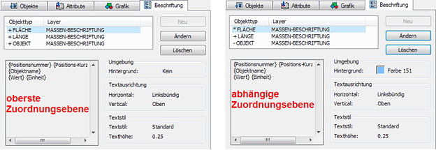 Im unteren Dialogbereich werden die Eigenschaften der aktuell ausgewählten Beschriftung eingeblendet. Dadurch ist stets ein guter Überblick über die Auswirkungen einer Beschriftung gegeben.