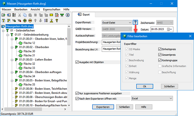 • Exportfilter – steuerbare Preisausgabe und Angabe der Kostengruppe.
