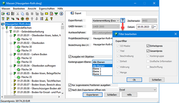 Die Ausgabe als Kostenermittlung ist nur dann sinnvoll, wenn den einzelnen Positionen Kostengruppen aus einer Kostengruppendatei zugeordnet wurden. Durch diese zusätzliche Information ist die formale Excel-Ausgabe nach DIN 276 möglich. Da die Ausgabetiefe und damit der Detaillierungsgrad beschränkt werden kann, ist es möglich, sowohl Kostenschätzungen als auch Kostenberechnungen auszugeben.