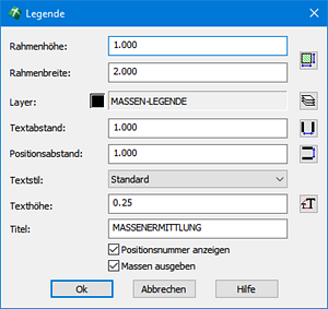 Dieser Schalter bewirkt die Ausgabe der Positionsmassen unterhalb der Positionstexte. Des Weiteren wird eine Zusammenfassung aller ermittelten Mengen am unteren Rand der Legende erzeugt. |