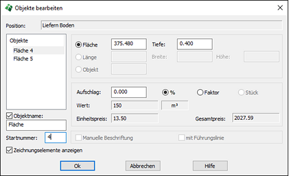 Wurden mehrere Objekte zugewiesen, können Sie auch alle Objekte und die Startnummer ändern, indem Sie den Schalter Objektname aktivieren und die nun zugänglichen Werte editieren. Des Weiteren können Sie einen Aufschlag festlegen, um z. B. Sicherheiten mit einzukalkulieren. Auch der tatsächlich ermittelte Wert eines Objektes kann direkt verändert werden. |