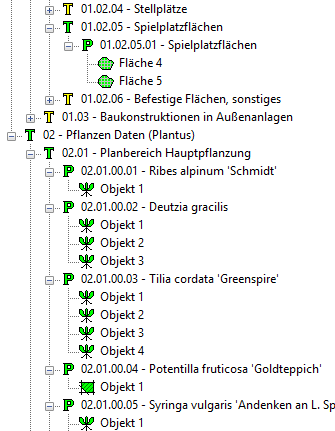 Die Positionen werden am Ende des Massenbaums unter der nächsten freien Nummer eingefügt. Dabei wird bei jedem Import der gesamte Inhalt der Pflanzen-Positionsliste der aktuell eingestellten Pflanzendatenbank übernommen. Positionen aus unterschiedlichen Quellen (Brunskatalog oder Plantus) werden als separate Titel angelegt. Sollten in der Zeichnung Pflanzen aus beiden Datenbanken enthalten sein, müssen Sie den Importvorgang wiederholen, nachdem Sie die Datenbank im Setup der Pflanzplanung umgestellt haben. Nur so ist sichergestellt, dass alle Pflanzen importiert werden. Die einzelnen Positionen werden mit dem Pflanzennamen angezeigt. Darunter befinden sich die einzelnen Pflanzenobjekte. Einzelpflanzen werden dabei durch ein Pflanzensymbol, Flächenpflanzungen als Flächensymbol dargestellt. Wie bei jedem Massenbaumobjekt können Sie mit der rechten Maustaste das Kontextmenü aufrufen und die selektierten Titel, Positionen oder Objekte anzeigen lassen. |