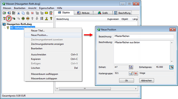 Um eine neuen Position zu erzeugen, selektieren Sie zunächst das Element, unter dem die neue Position aufgeführt werden soll. Anschließend können Sie den Befehl Neue Position aus dem Pull-down-Menü Massen, aus dem Kontextmenü oder durch anklicken des entsprechenden Icons auswählen.