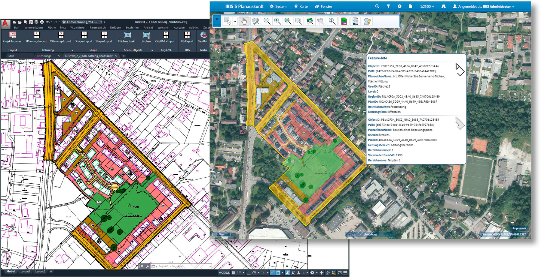 IRIS (Integratives RaumInformationsSystem) ist eine WebGIS-Lösung der Firma Widemann Systeme Technologie GmbH, die Ihnen das Finden und Präsentieren von Karten- und Sachdateninformationen schnell und sicher ermöglicht. Der Befehl IRIS-Export im Modul GeoXchange generiert dabei Ausgabeformate, um die Plangrafik und Sachdaten eines WS LANDCAD-Bauleitplans an an die WS LANDCAD Planauskunft zu übergeben.