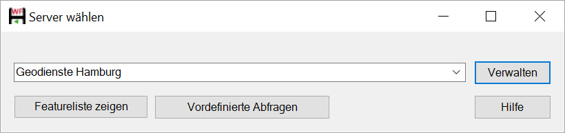 Beim Aufruf des Befehls WFS-Import erscheint zunächst der Dialog Server wählen, in dessen Eingabezeile Sie entweder eine Serveradresse eingeben oder einen benannten Server mit Hilfe einer Klappliste wählen können. Hierbei handelt es sich um einen Internetserver, welcher den jeweiligen WFS-Dienst zur Verfügung stellt. Ein WFS-Dienst ist ein Internet-gestützter Zugriff auf Geodaten, dessen Zeichnungsinformationen auf Vektordaten beruhen. Der Dienst gibt die Daten hierbei im GML-Format zurück.