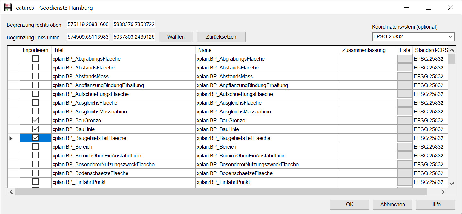 Die angezeigten Features sind unabhängig von einer Begrenzung, d. h. es werden immer alle verfügbaren Features des Dienstes angezeigt. Allerdings werden durch die Wahl einer Begrenzung aus den zu importierenden Features nur solche Objekte importiert, die innerhalb der Begrenzung liegen oder diese schneiden. Die Begrenzung verhindert also, dass alle verfügbaren Objekte importiert werden, was je nach dem enthaltenen Gebiet u. U. eine große Datenmenge bedeuten würde.