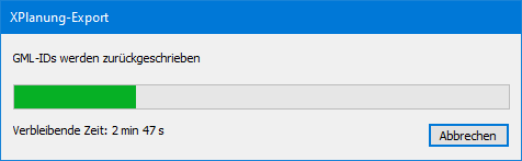 Das Zurückschreiben der GML-IDs kann in großen Plänen etwas Zeit in Anspruch nehmen. Wenn man den Prozess abbricht, werden einige Planzeichen in der DWG keine GML-IDs erhalten. In der exportierten XPlanGML stehen sie aber auf jeden Fall. Es ist bei einem anschließenden Export jedoch nicht sichergestellt, dass ein Fachobjekt in der GML dieselbe GML-ID erhält wie beim vorherigen Exportdurchgang. Der Nachteil daran ist, dass ein Planzeichen in einem Bestandsprojekt bereits in einem Geodatenserver einer Kommune hochgeladen wurde. Darin ist es über die GML-ID auffindbar. Wenn durch eine Planänderung dann ein Objekt erneut hochgeladen wird, aber mit anderer GML-ID, können im Geodatenserver abgespeicherte Abfragen u. U. unwirksam werden.