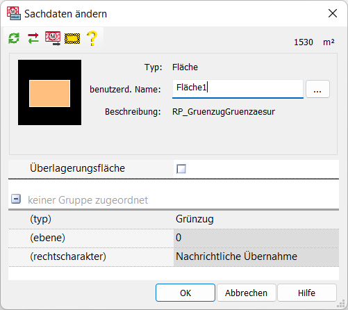 Der Objektklassenname eines unbekannten XPlan-Objektes wird in die Beschreibung übernommen - hier beispielsweise RP_GruenzugGruenzaesur. Wurde ein unbekanntes Attribut eingelesen, wird es im Sachdaten-Dialog in Klammern gesetzt. Die Werte des Sachdatenfeldes können nicht editiert werden und sind demzufolge grau hinterlegt. |