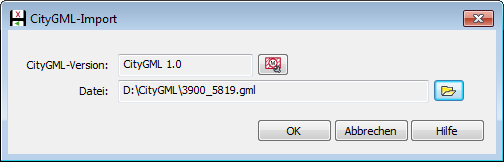 Der Befehl CityGML-Import startet mit der Auswahl der zu importierenden Datei. Es kann zunächst nur eine Datei gewählt werden.